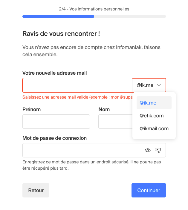 Pour créer votre nouvelle adresse mail, vous devrez choisir entre les trois suffixes @ik.me, @etik.com et @ikmail.com. Choisir un mot de passe très solide avec des majuscules, des minuscules, au moins un chiffre et un signe particulier. Puis continuer.