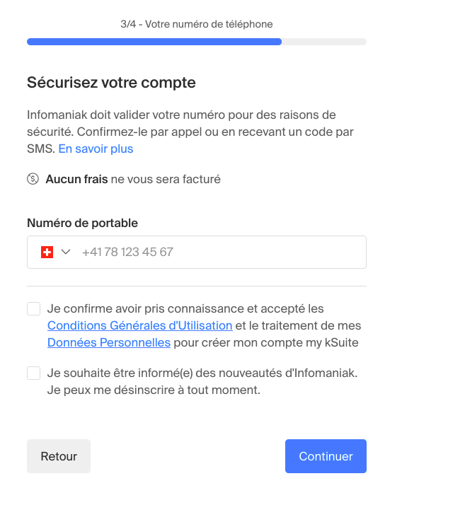Pour sécuriser votre compte, vous allez saisir votre numéro de portable de la façon suivante : +33 suivi de votre numéro sans le 0 initial. Confirmer, et continuer.